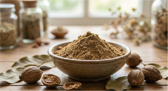 Herbal, triple-sifted Terminalia bellirica (Baheda) powder made from crushed, deseeded dried fruits, free from preservatives and added chemicals