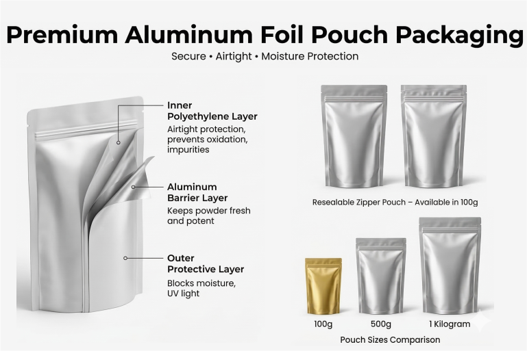 We use high-barrier aluminum foil pouches to protect herbal powders from moisture, air, and light exposure.