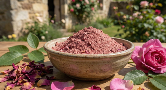 Natural, triple-sifted Rose Petal Powder made from crushed dried rose petals, free from preservatives and added chemicals.